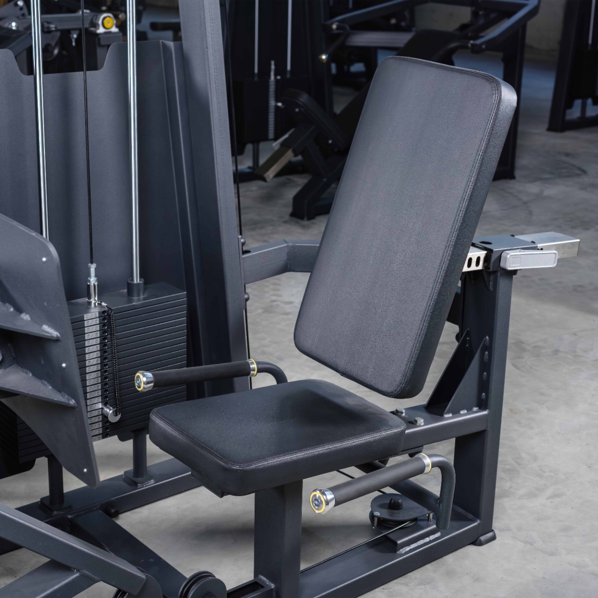 Система нагрузки – тросовая, с весовым стеком 100 кг. Весовой стек выполнен из стальных плит с порошковым покрытием.