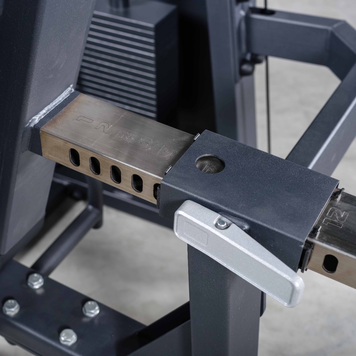 Рукояти для упора расположены на уровне сиденья, параллельно, обеспечивая устойчивую фиксацию корпуса при выполнении упражнения. Изготовлены из металлического прутка с резиновым покрытием и оснащены алюминиевыми декоративными заглушками, зафиксированными болтовым соединением, что обеспечивает надёжный хват и контроль положения тела при работе с нагрузкой.