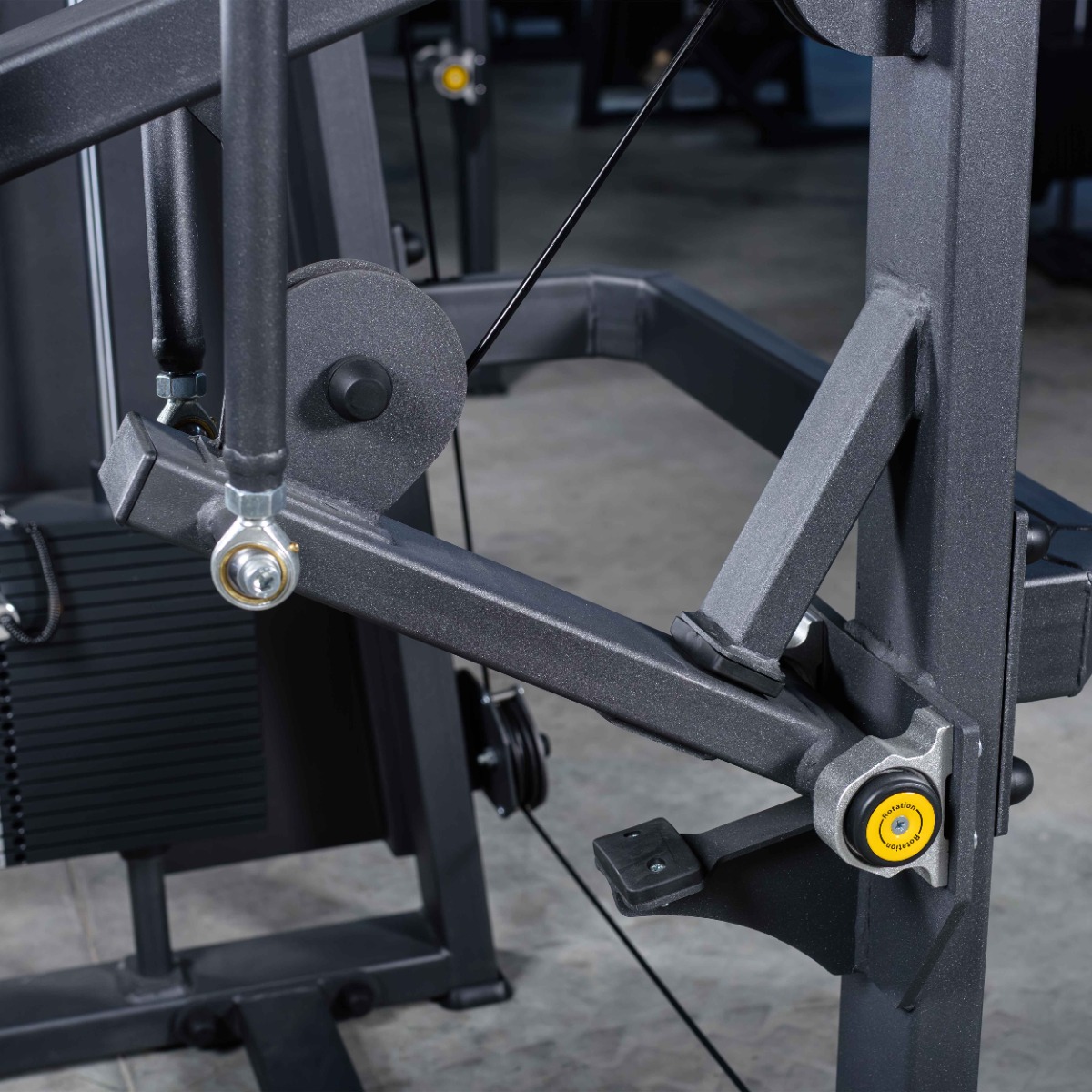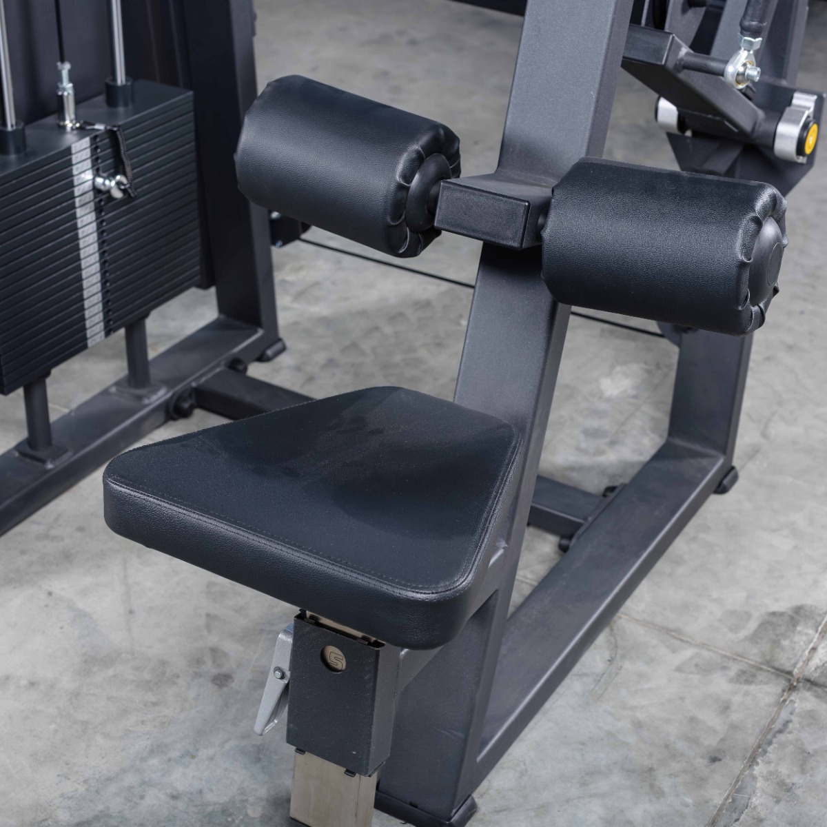 Система нагрузки – тросовая, с весовым стеком 100 кг. Весовой стек выполнен из стальных плит с порошковым покрытием.