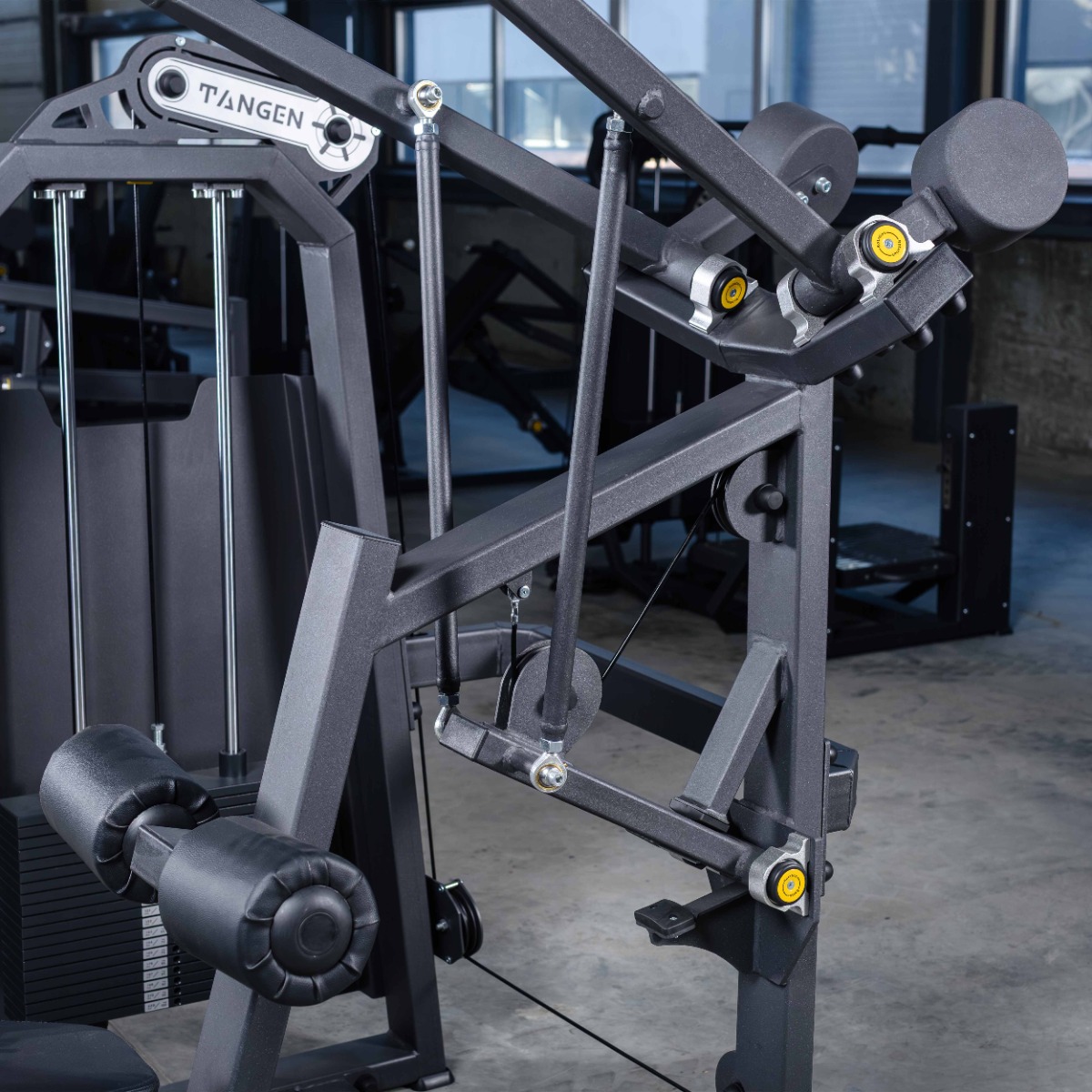 Профессиональный тренажёр TANGEN A2035 Тяга сверху (вертикальный блок) предназначен для тренировки широчайших мышц спины. В процессе выполнения упражнения также активно включаются бицепсы, задние пучки дельтовидных мышц и мышцы плечевого пояса. Конструкция обеспечивает стабильную фиксацию корпуса и позволяет выполнять тягу по вертикальной траектории с контролируемой амплитудой движения.