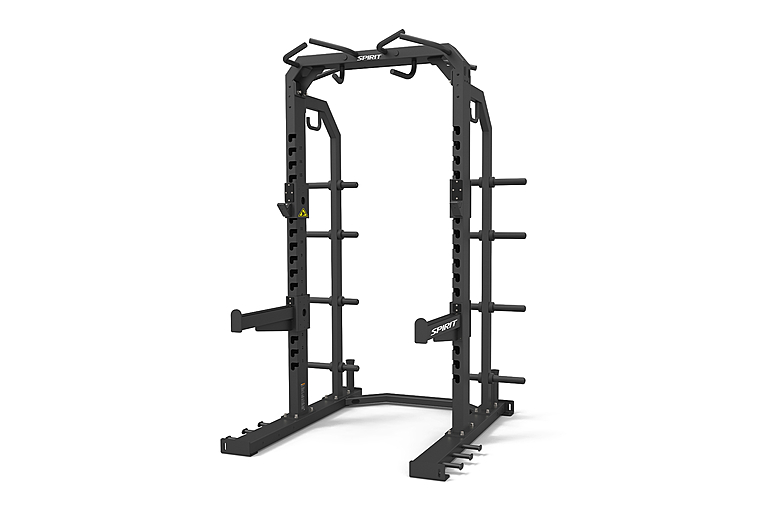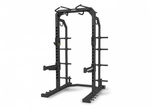 Изготовлена из высокопрочной стали, выдерживает высокий уровень нагрузки. Силовая рама оснащена регулируемыми по высоте страховочными упорами и фиксаторами для штанги, которые можно подстраивать под рост спортсмена или под конкретные тренировки, так же это позволяет установить скамью для выполнения упражнения жим из положений сидя или лежа. Вверху силовой рамы имеются две удобные многопозиционные рукояти, выполняющие функцию турника, с резиновым покрытием и декоративными заглушками – наконечниками, зафиксированными болтом.