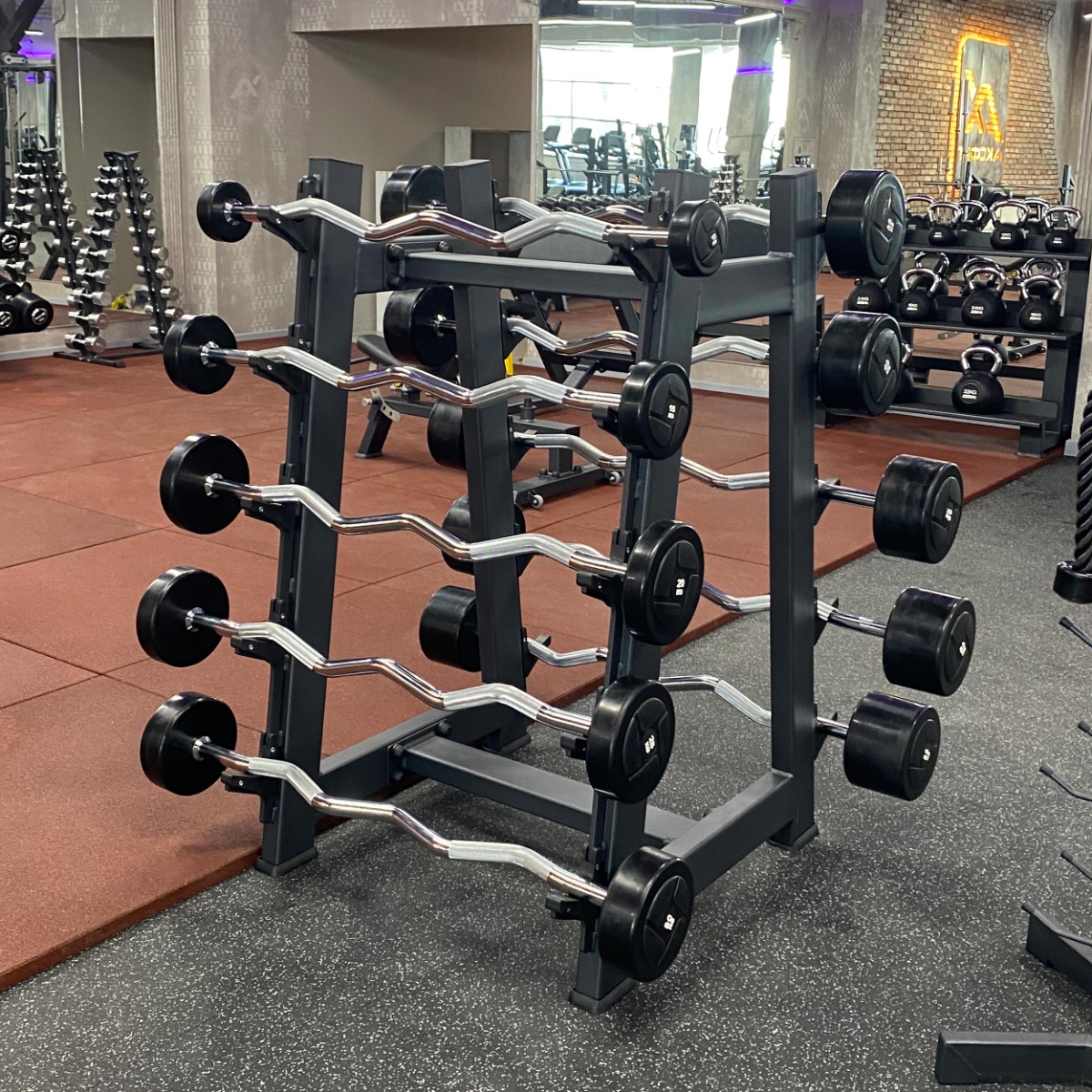 Профессиональная стойка для коммерческого использования A3055 Стойка для штанг (на 10 шт.) предназначена для безопасного и компактного хранения грифов и неразборных штанг различного типа. Конструкция обеспечивает удобный доступ, экономит пространство и поддерживает порядок в зоне свободных весов.
