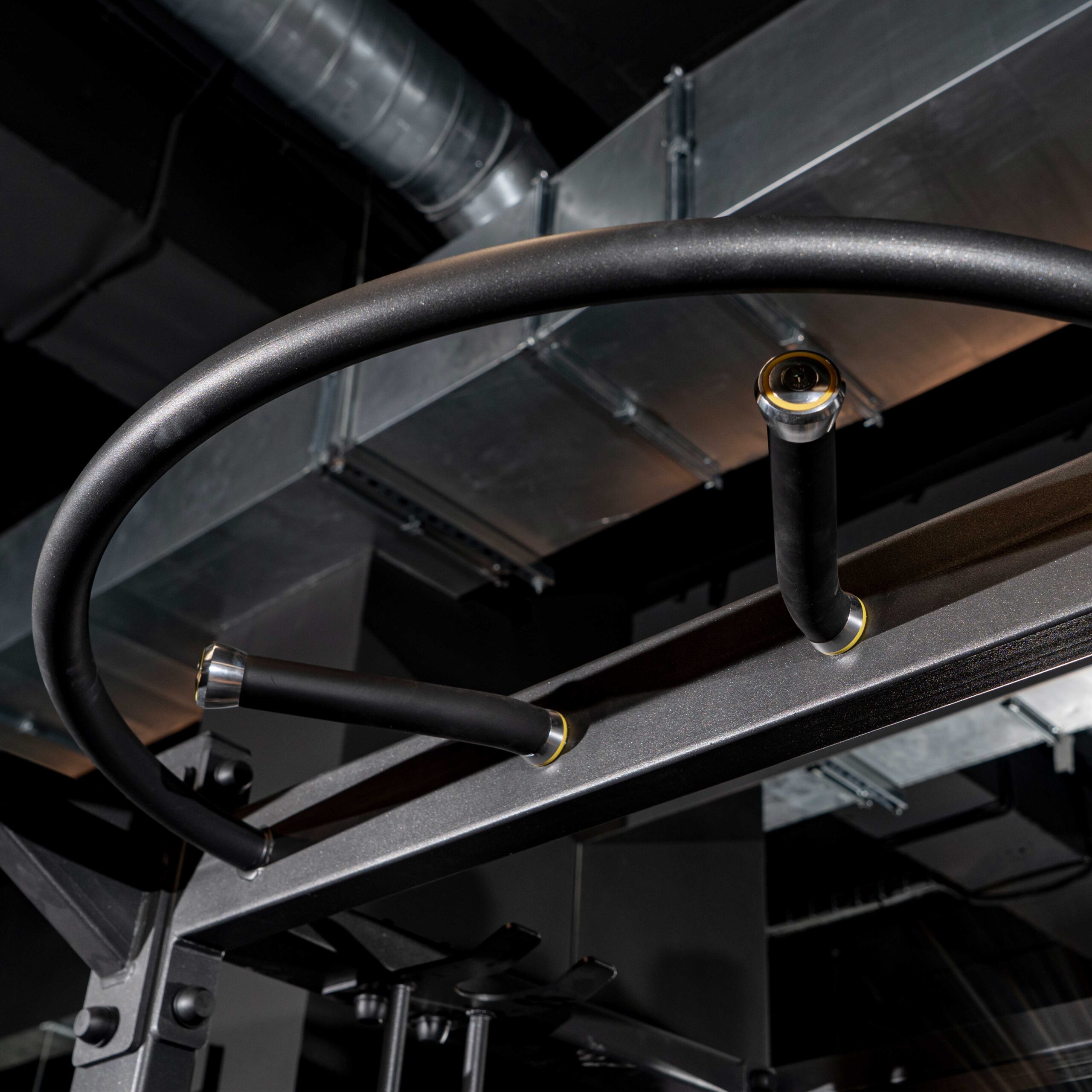 Основание многопозиционных рукояток турника выполнено из стальной трубы диаметром 27 мм и толщиной стенки 3 мм. Основания консольных рукояток дополнительно закрывает резиновая трубка и декоративные алюминиевые наконечники.