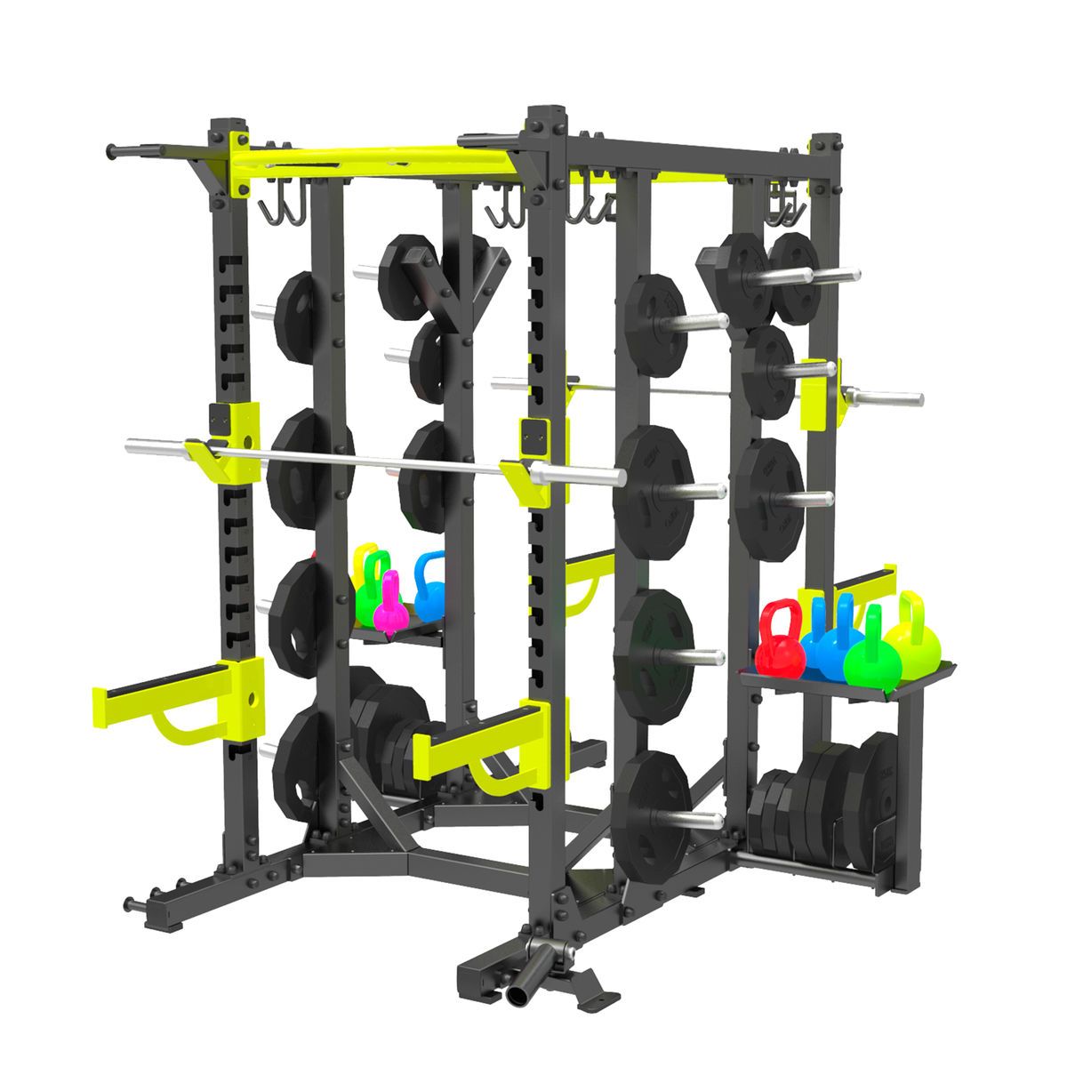 Силовая рама состоит из следующих основных элементов:Стойки перфорированные – 2 шт.Перемычка – 2шт.Перемычка-турник – 1 шт.Страховочные упоры – 1 комплект. Крюки для штанги – 1 комплект.Кронштейн верхний – 2 шт.Многопозиционные рукоятки – 2шт. Кронштейн для дисков – 10 шт.Держатель для штанги с крюками – 2 шт.Кронштейн тройной для эспандеров – 2 шт.