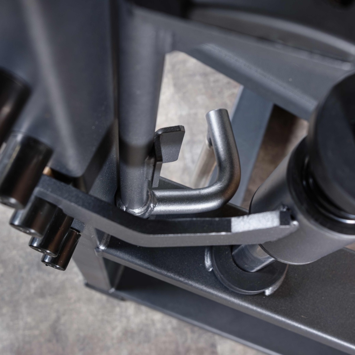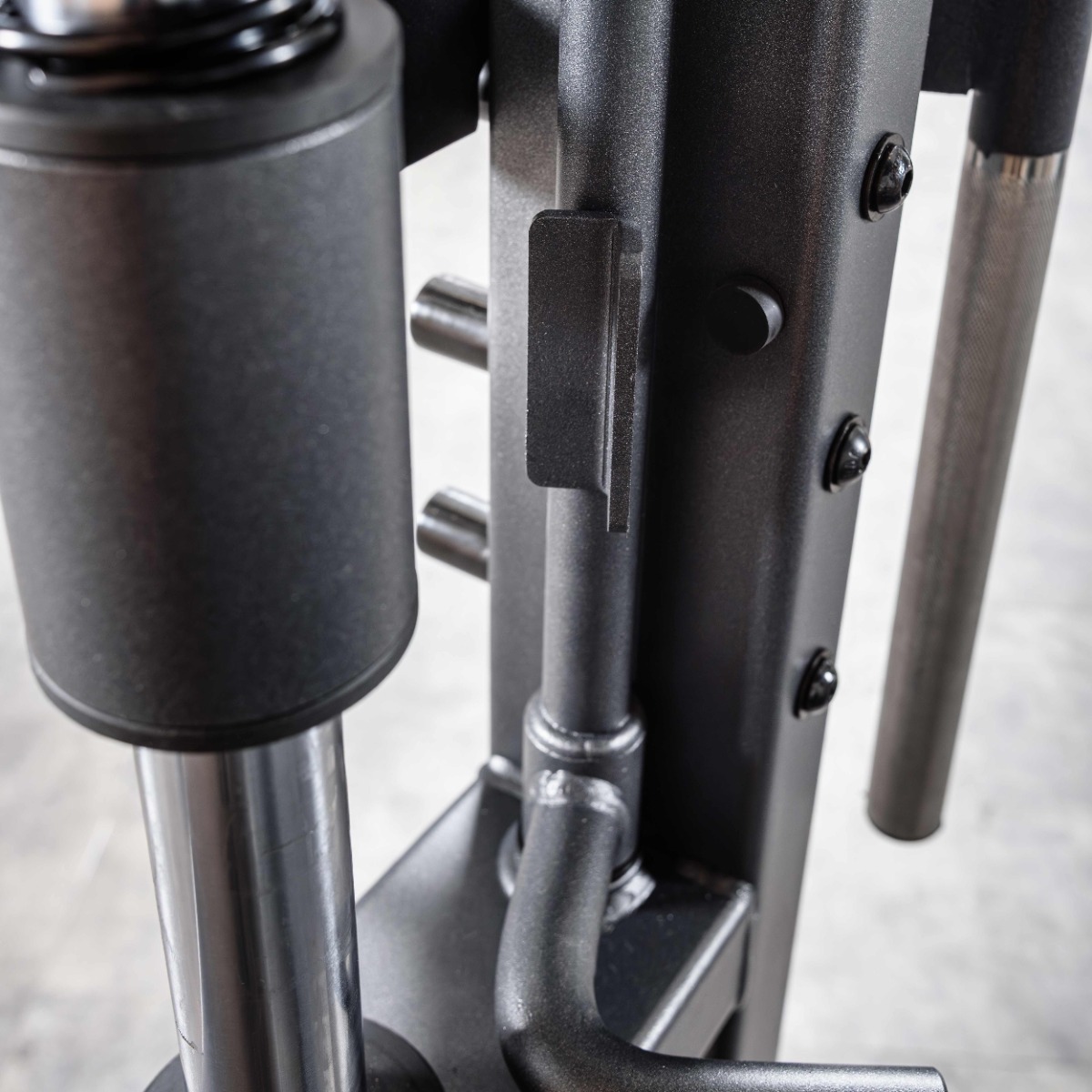 На раме тренажера установлены рукояти с двумя парными вертикальными металлическими упорами (фиксаторами) с резиновыми отбойниками для амортизации при завершении подхода. Вертикальное расстояние между упорами 250 мм.