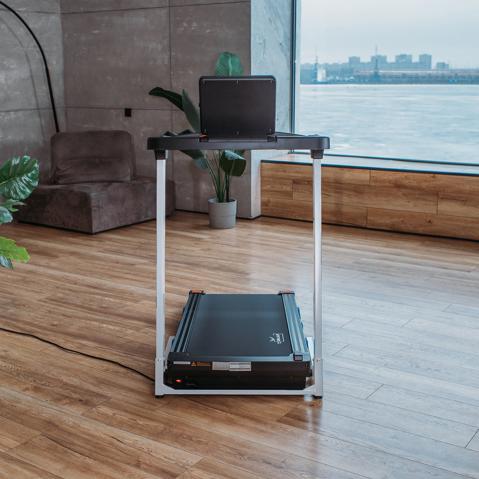 Одна из особенностей тренажера — расположение моторного отсека. Он находится не перед беговым полотном, как обычно, а под ним. За счет этого длина дорожки значительно сократилась, а перед беговым полотном остался только тонкий плоский бортик.