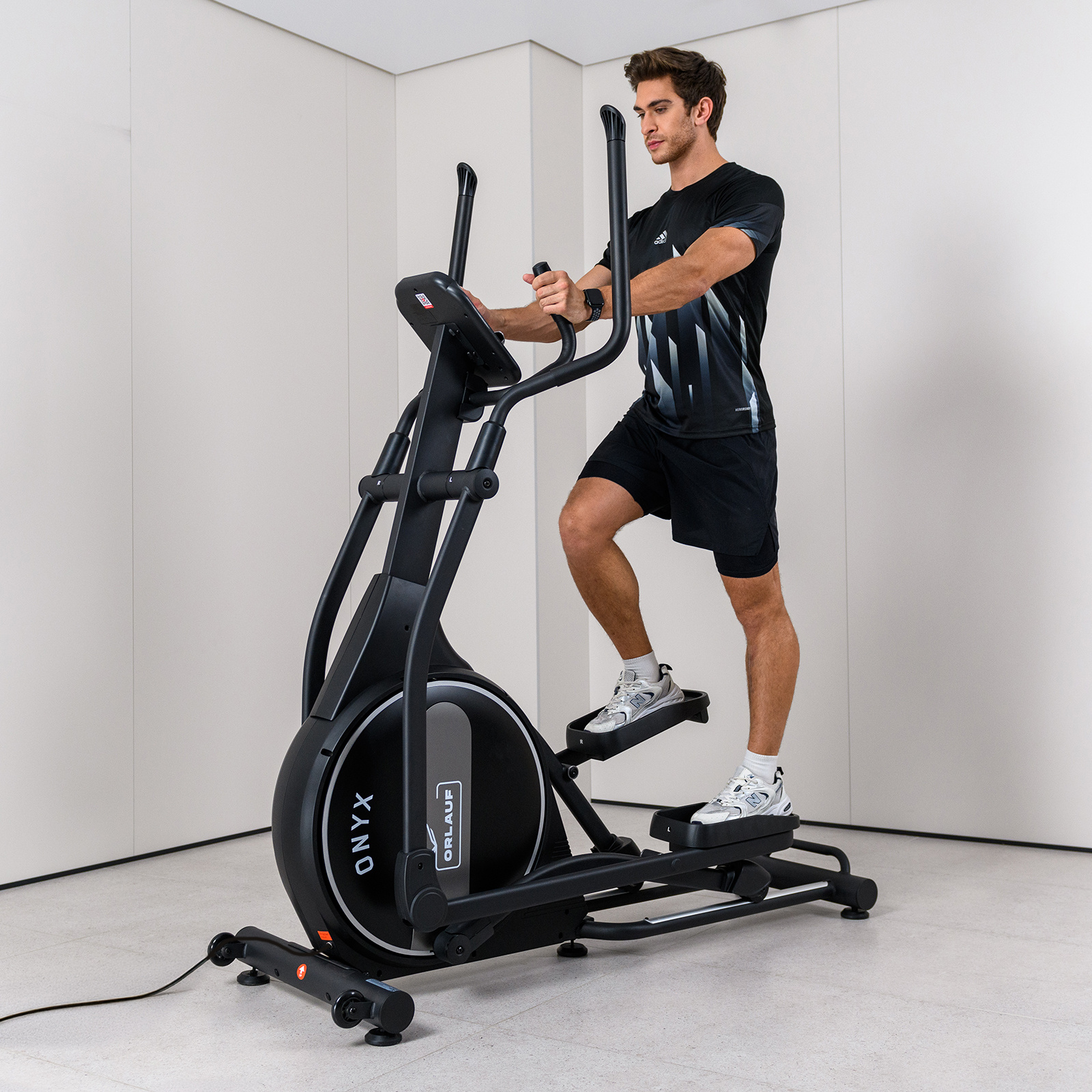 Эргономика Orlauf Onyx продумана для комфортных тренировок. Длина шага 51 см и расстояние между педалями 6 см обеспечивают удобное положение тела. Встроенные сенсорные датчики пульса и совместимость с беспроводным кардиопоясом помогают контролировать эффективность занятий.