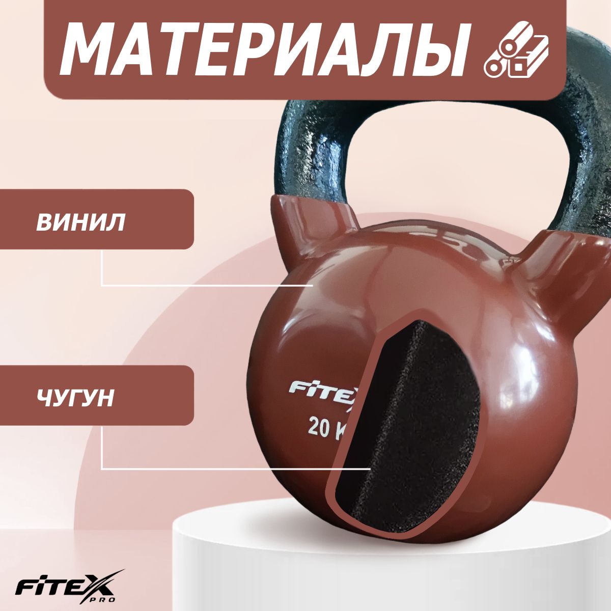 Гиря FITEX PRO сделана из чугуна и имеет плотное виниловое покрытие, которое не окрашивает стены и пол, снизит шум и убережет кожу рук от раздражения.