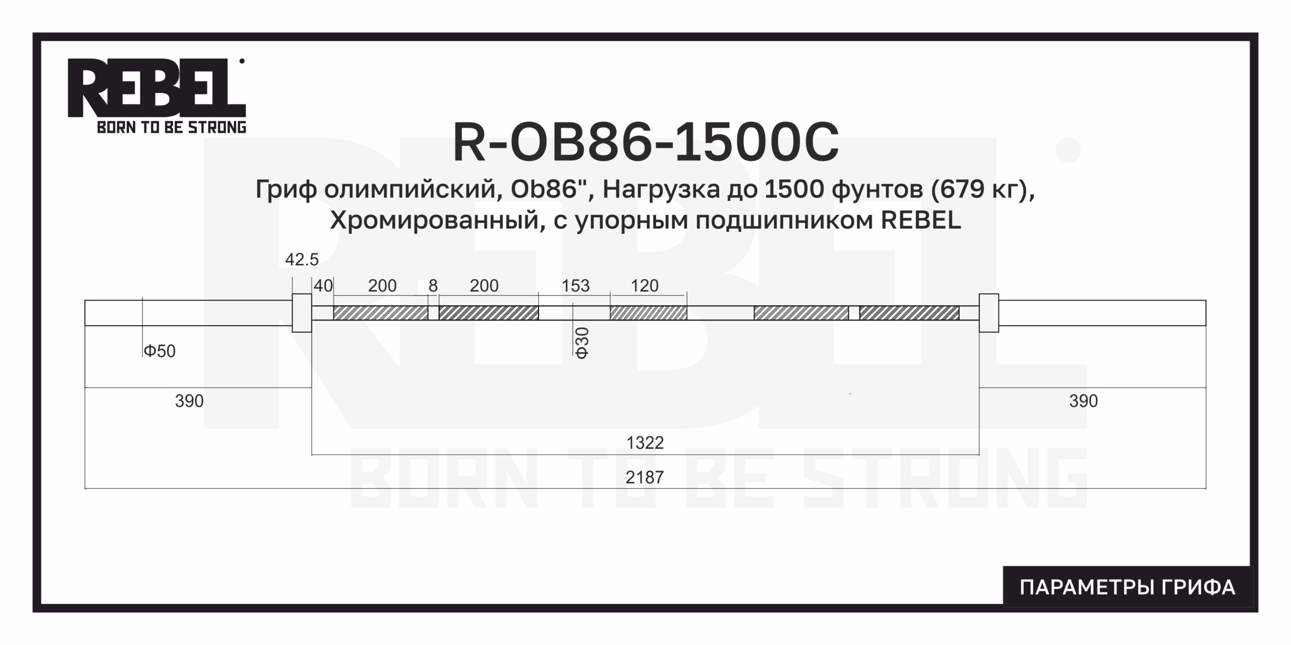 Гриф олимпийский прямой 86″, до 679 кг, с упорным подшипником REBEL