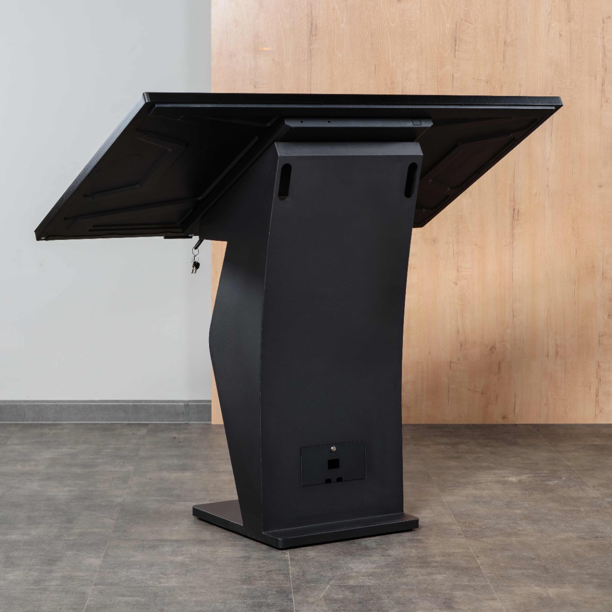 Мониторный блок фиксируется на стойке через усиленное крепление с замком, что исключает расшатывание и ограничивает доступ к коммуникациям.