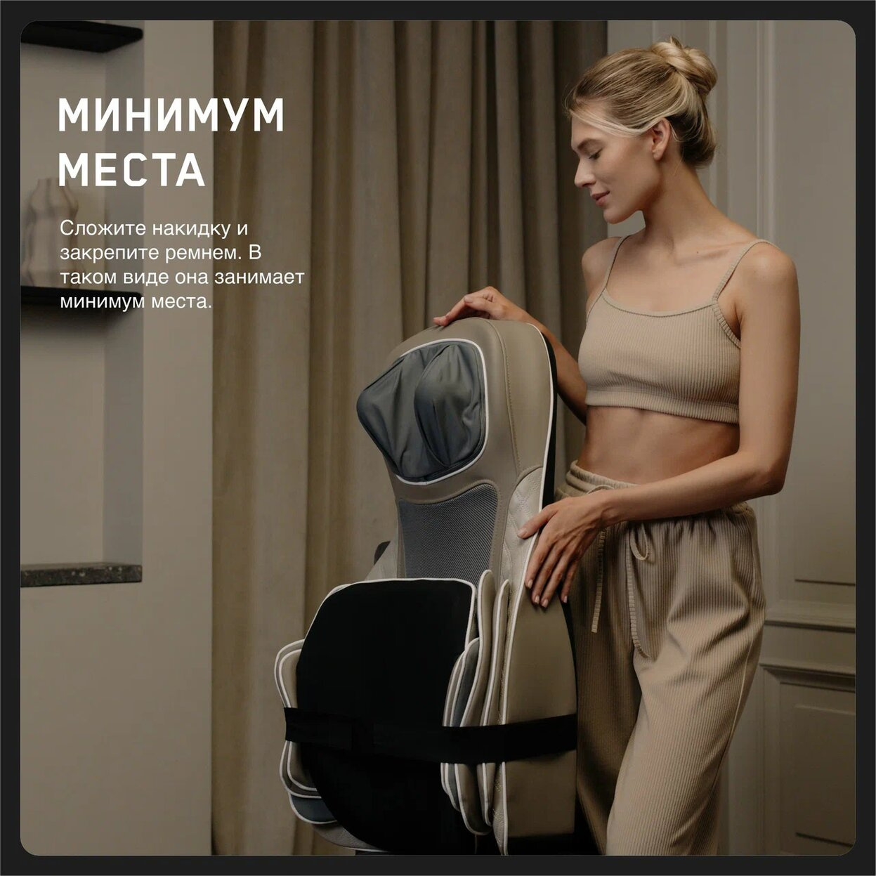 Orlauf Renewed Body крепится к стулу или креслу с помощью широкого крепкого ремня. После массажа, когда накидка не нужна, ее можно сложить и закрепить тем же ремнем. В сложенном виде она занимает минимум места.