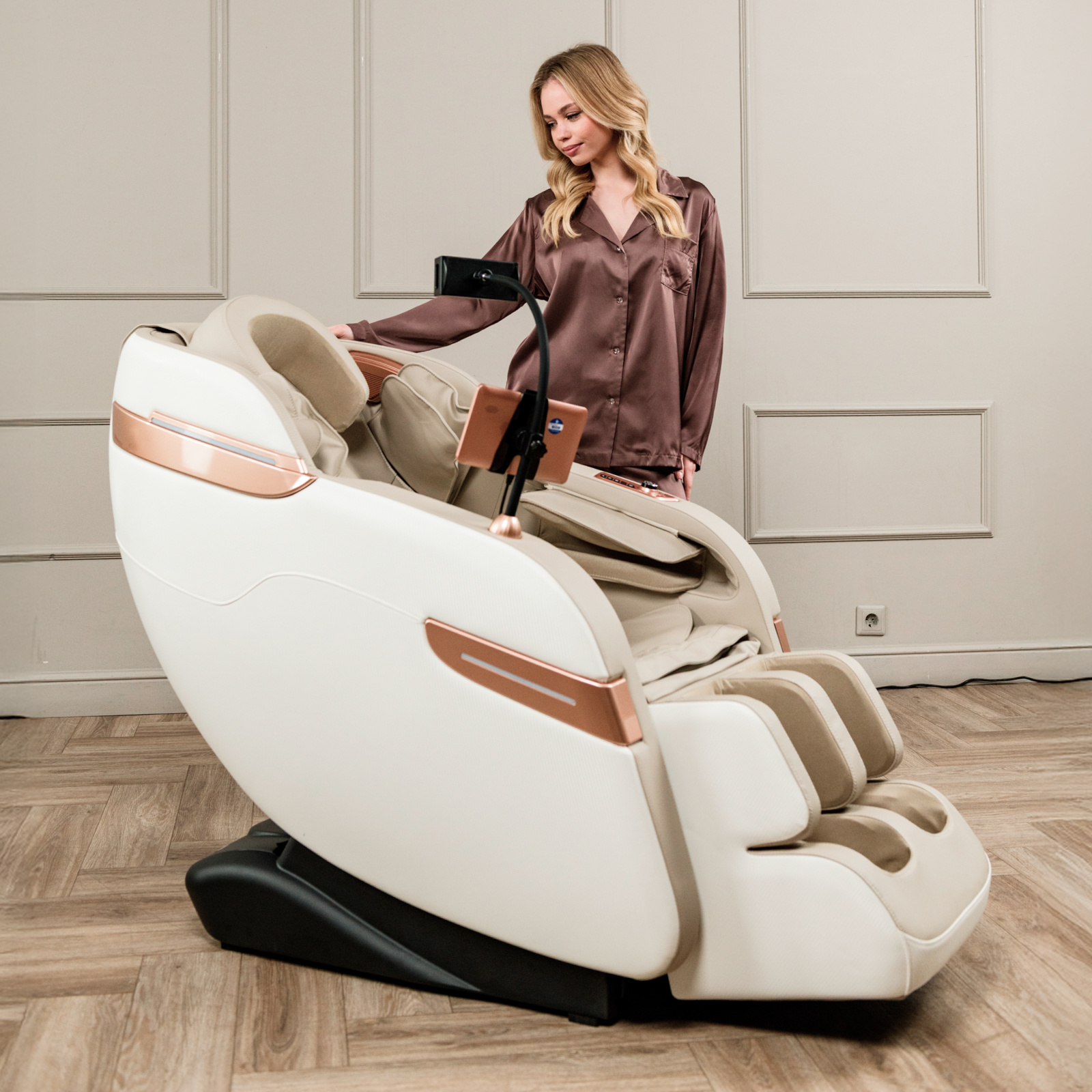 Управление креслом реализовано через планшет и кнопки быстрого доступа, а специальная подставка для телефона дополнена элементами управления. Orlauf Mainz дополняется встроенными Bluetooth-колонками для прослушивания музыки и транспортировочными роликами для удобного перемещения. Стильный дизайн в цвете Peach Ease и отделка Abriebfest из износостойких материалов делают Orlauf Mainz не только функциональным устройством, но и стильным элементом интерьера.
