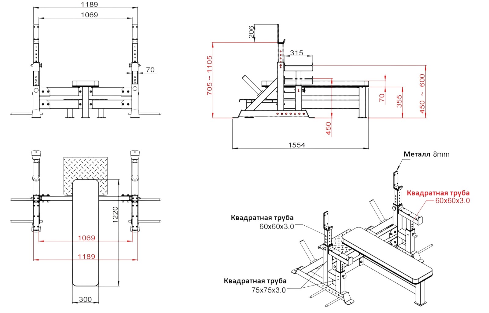 Сверхпрочная стальная рама из профиля 75х75мм, толщиной 3мм.. Прочная виниловая обивка подушки толщиной 70мм.. Размер подушки 1220х300мм. Штыри для работы с резиновыми лентами. Ударопрочный пластик на крюках и страховочных упорах. Длина кронштейнов под диски 355мм, диаметр 48мм. Вес изделия в собранном виде 95кг.
