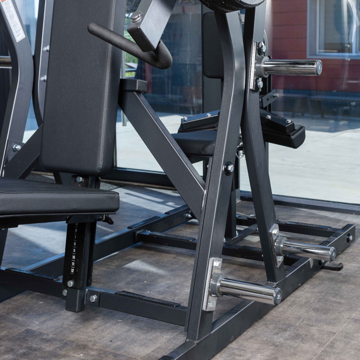 Количество хромированных накопителей для хранения свободных весов: 6 штук из толстостенной стальной трубы диаметром 48 мм. Максимальный вес на накопитель: 100 кг.