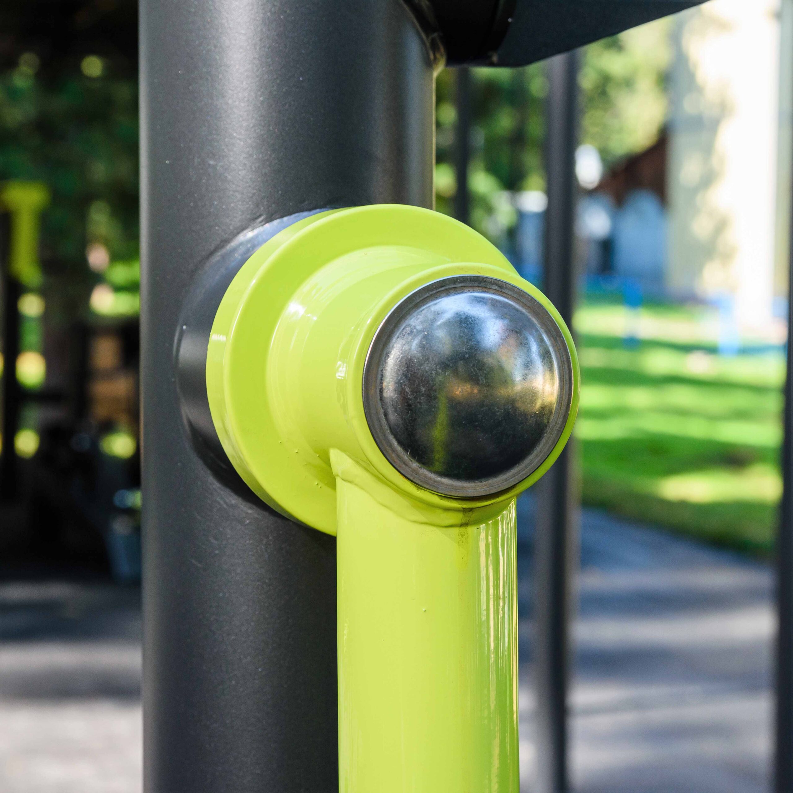 Фланцевое соединение опорного столба с закладной производится через четыре овальных отверстия размером 22×30 мм, расположенных на расстоянии 240 мм. Овальные отверстия под болтовое крепление М16 позволяют дополнительно регулировать положение тренажера. Резьбовые соединения защищены составными металлическими колпачками, входящими в комплект поставки.