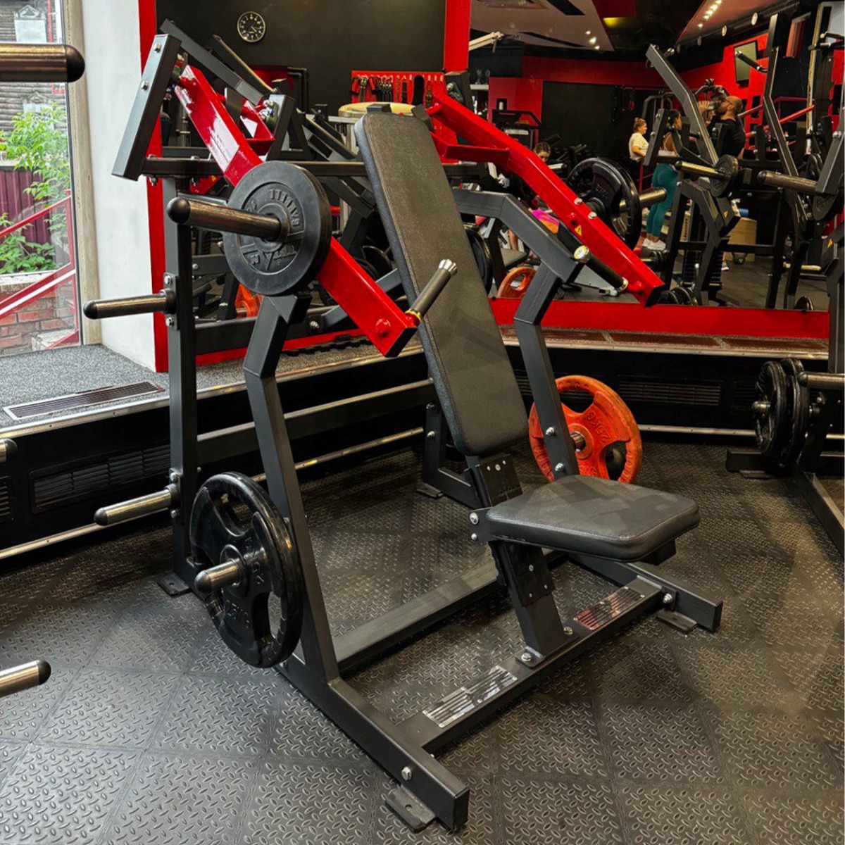 Два хромированных накопителя под углом на подвижных рычагах и шесть хромированных накопителей для хранения свободных весов изготовлены из толстостенной стальной трубы. На торцах накопителей установлены заглушки из пластика.