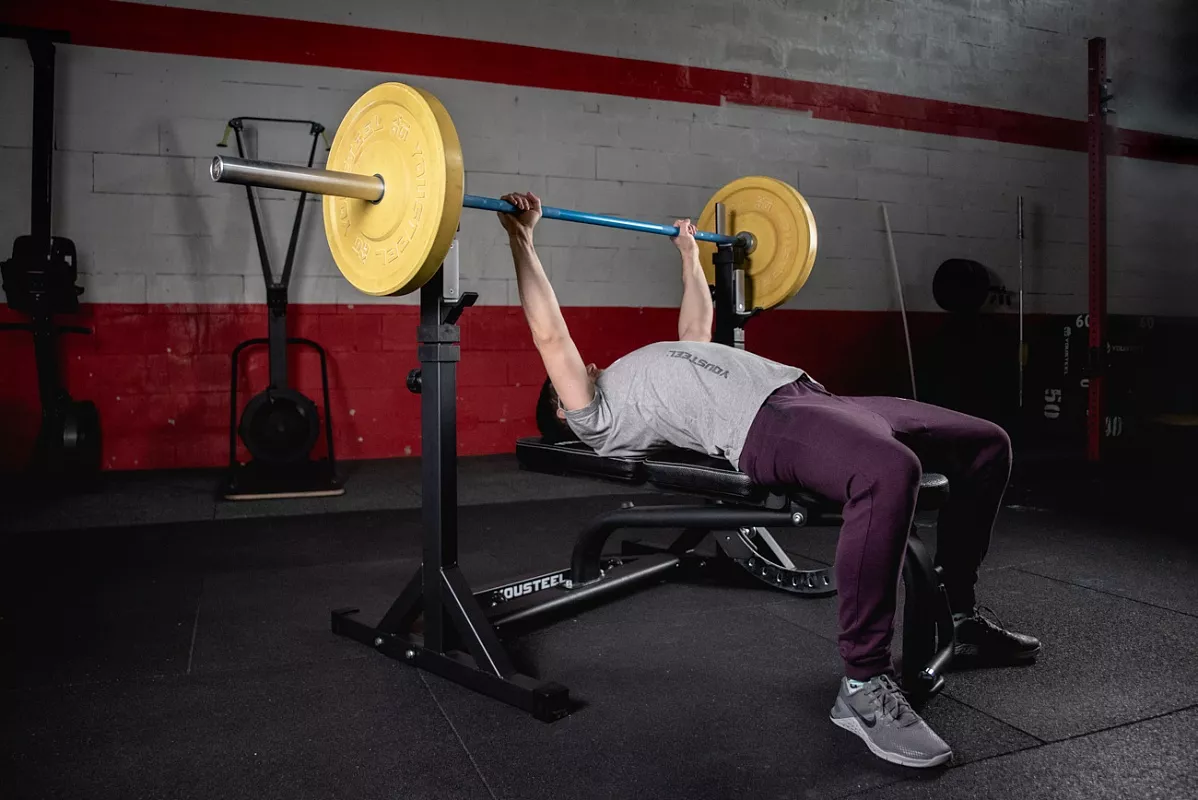 В этой версии стоек мы доработали конструкцию опоры, фиксирующие болты и изменили конструкцию нижней пары крюков, которые теперь по форме повторяют верхние. Благодаря этому выполнять жим лёжа стало гораздо удобней. Стойки стали жестче и устойчивее за счет того, что мы убрали механизм регулировки ширины. Теперь внутренняя ширина фиксированная – 1100мм. Механизм фиксации – болт с пружинным фиксатором. Во время тренировок с большими весами его можно закрутить, тем самым увеличив жёсткость фиксации. Но для ежедневных тренировок рядовых клиентов это не обязательно. На стойках 4 таких болта: 2 на регулировку высоты стоек и 2 на страховочные упоры. Верхние и нижние крюки покрыты пластиком, для предотвращения повреждения насечки грифа.
