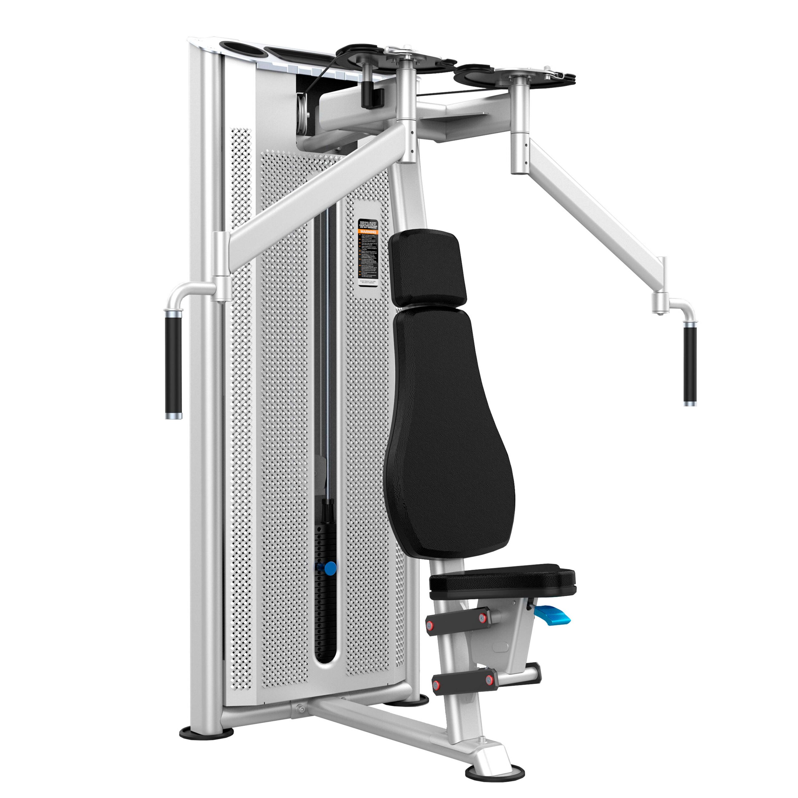 Металлическая перфорированная защита весового стека с лицевой стороны и сплошная защита с задней стороны выполнена из листового металла толщиной 2 мм. Ребра жесткости у основания, примыкающие к несущей раме через скрытое болтовое соединение сечением 6 мм в восьми точках, повышают эксплуатационные параметры тренажера.
