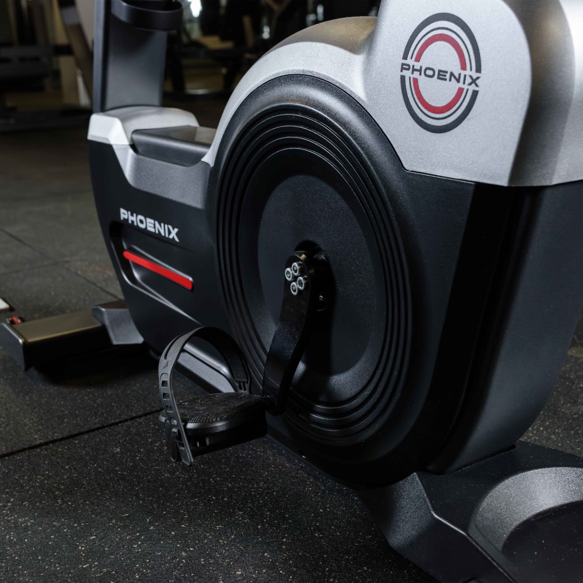 Педали велотренажера выполнены из высокопрочного пластика с обрезиненным покрытием. Для надежной фиксации стоп поверхность педалей имеет линейный протектор и ремни из эластичного пластика 345×44 мм с восьмью регулировочными отверстиям 14×5 мм.