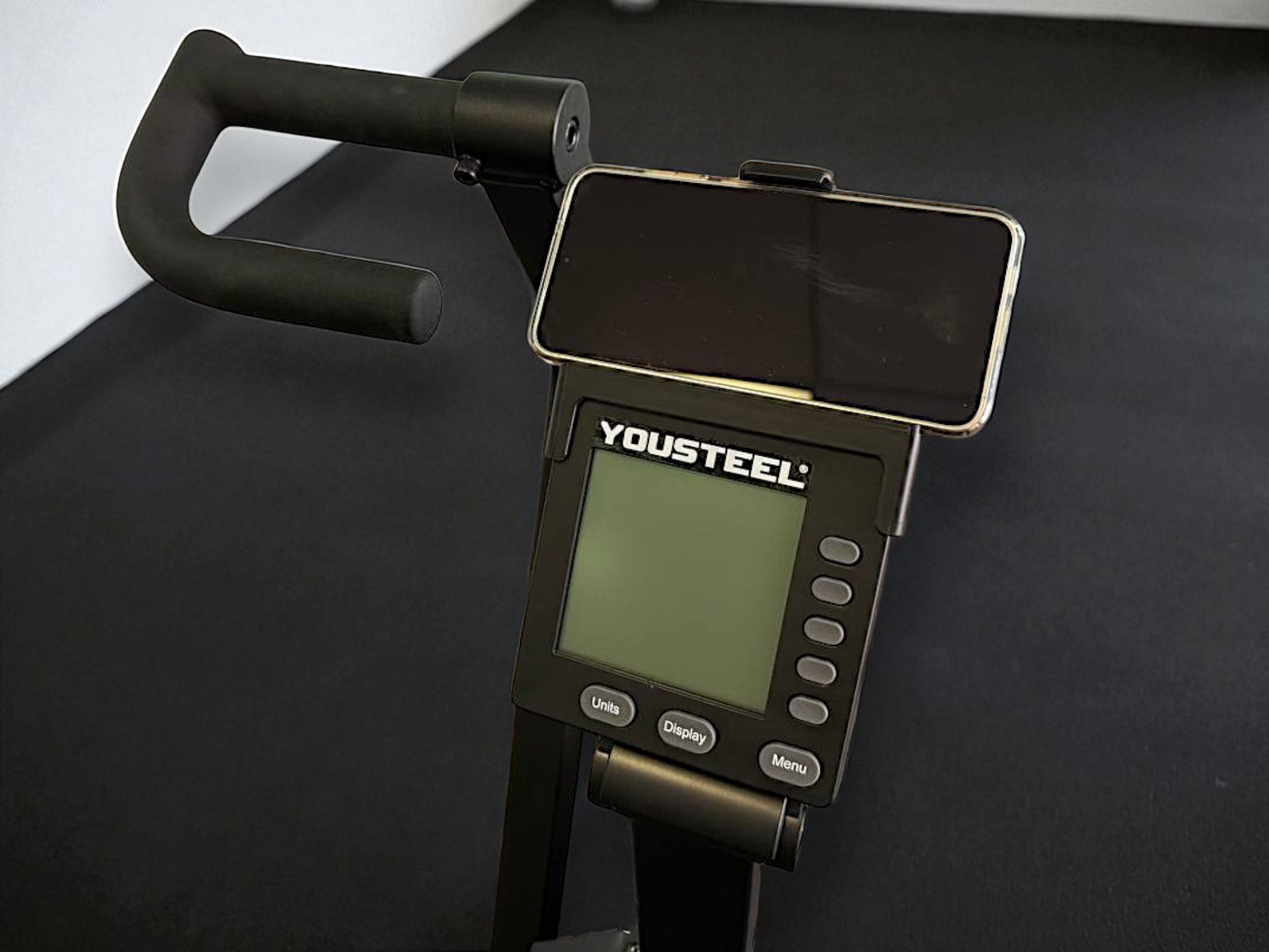 Тренажер оснащен ЖК-дисплеем, который не только отслеживает интервалы, расстояние, сожженные калории, пульс и другие параметры, но также поддерживает работу с датчиками сердечного ритма. Удобный держатель для телефона над монитором позволит вам смотреть видео во время работы.