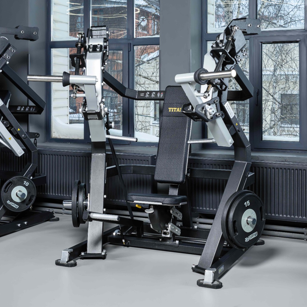На подвижных рычагах для работы со свободными весами установлено два литых хромированных накопителя из толстостенной стальной трубы длиной 300 мм для дисков с посадочным диаметром 50 мм.